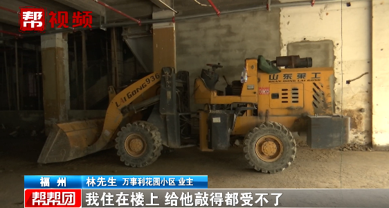 随后记者来到装修现场,看到店面内竟然停放着挖掘机和推土机等设备。业主怀疑就是这些设备给他们房子造成影响。