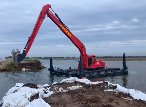 2025年8月,山河智能水陆两栖挖掘机参加内蒙古自治区土默特右旗双龙镇堤坝溃口实战救援。