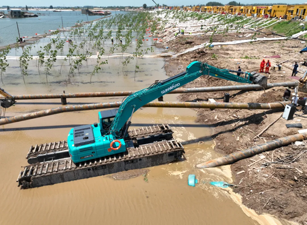 2024年7月,山河智能水陆两栖挖掘机参与湖南华容团洲垸洞庭湖决堤抢险救援。